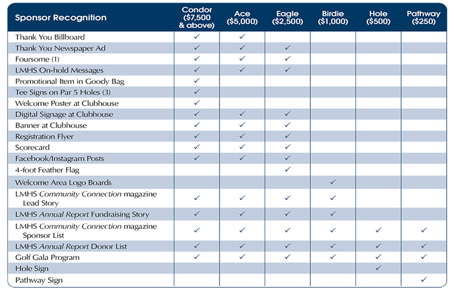 A variety of Exclusive sponsorships are available at the $1,500 level on an individual basis for groups or organizations. These sponsorships feature recognition on the Golf Gala digital signage, scorecard, and event program, plus additional recognition specific to each designation. All Exclusive sponsors will be acknowledged in the LMHS