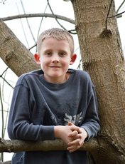 Somehow, Caleb finds time for two other favorite outdoor activities – bicycling and climbing trees. “I pull myself up on the first branch – it is not too high. My mom does not let me go any higher because she is afraid that I will fall,” he explained.