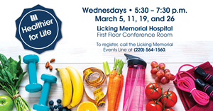 Licking Memorial Health Systems invites the community to participate in Community Education: Healthier for Life in March. The event is a four-part program held on four consecutive weeks, Wednesday, March 5, Tuesday, March 11, and Wednesdays, March 19 and March 26, from 5:30 to 7:30 p.m., in the Licking Memorial Hospital First Floor Conference Room. Dietitian Jen Hartman, R.D.N., Patient Educator Meghan Rine, B.S.N., R.N., and Physical Therapist Assistant Erika Wills, P.T.A., will offer information about making small, positive changes that lead to a healthier lifestyle. Participants who have not attended the classes in the past should plan to attend all four sessions.