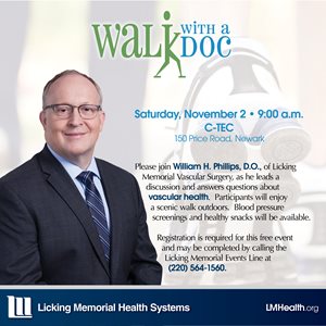 Licking Memorial Health Systems (LMHS) will host a Walk with a Doc event on Saturday, November 2, at 9:00 a.m. Participants will enjoy a casual 40-minute walk at the Career and Technology Education Centers of Licking County (C-TEC) in Newark. William Phillips, D.O., of Licking Memorial Vascular Surgery, will lead a discussion and answer general questions about vascular health.